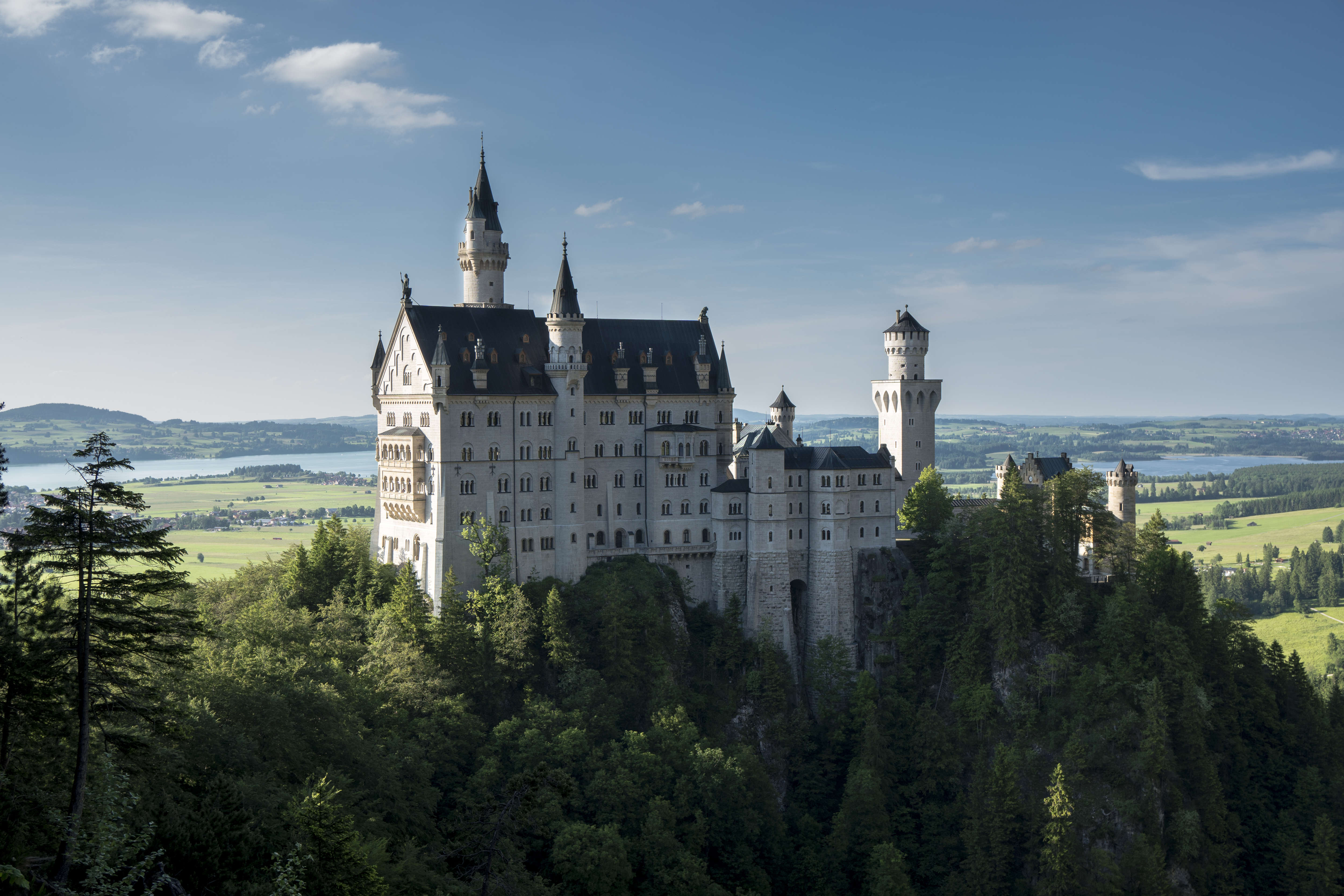 Более впечатляющий родственный замок Хоэншвангау, Нойшванштайн, был построен королем Людвигом II в честь композитора Рихарда Вагнера и использовался в качестве личного убежища застенчивого «сказочного короля».