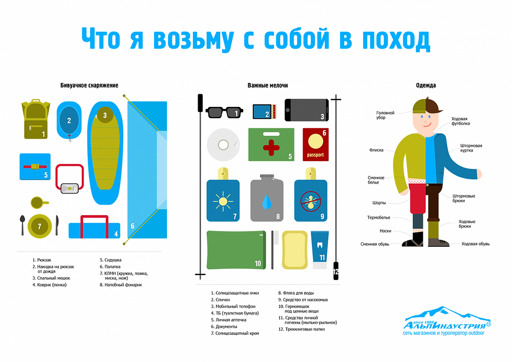 | Фонарик | Дорожный мешок | Водонепроницаемая верхняя одежда |