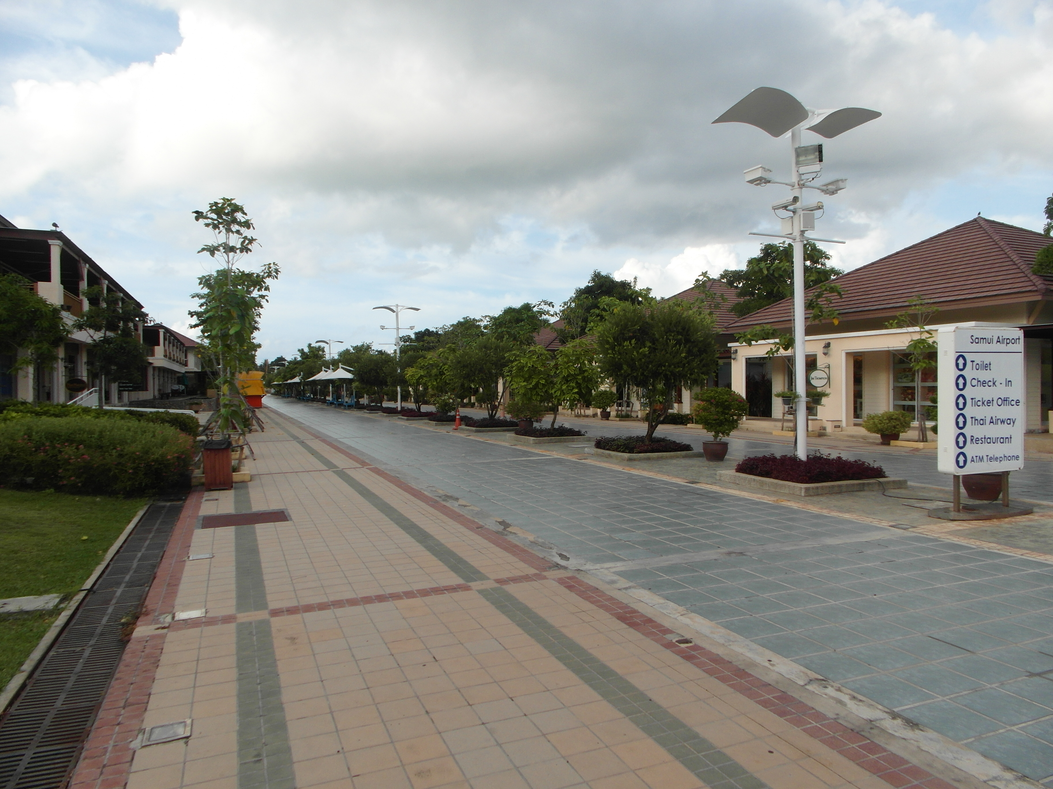 Международный аэропорт Самуи имеет только один этаж и он напоминает бунгало без стен или беседку. Он окружен аккуратными газонами, цветами, клумбами, маленькими магазинами и дорожками. Там приятно прогуляться, посидеть на скамейке и посмотреть на всю эту красоту. Даже долгое ожидание своего вылета не будет в тягость, когда окружают такие пейзажи, ощущение, что находишься в каком-то фешенебельном резорте.