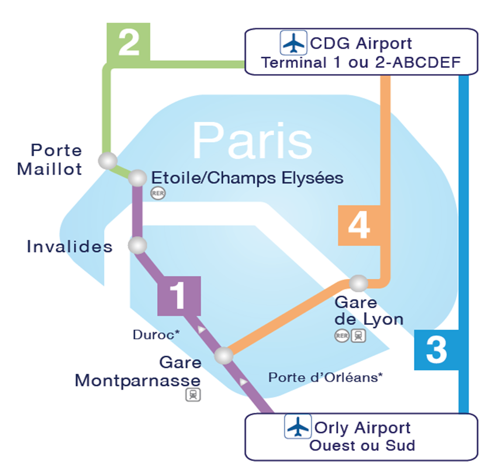 Аэропорт Орли — меньший международный аэропорт на юго-западе города. Имеет два терминала: Orly Sud и Orly Ouest. Весь транспорт останавливается на обоих терминалах.