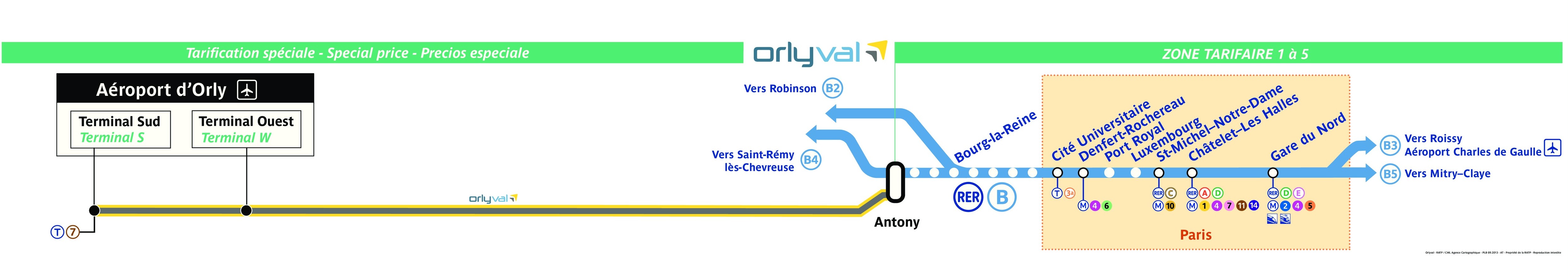 Поезд Orlyval соединяет аэропорт Орли с вокзал Антоний . Здесь вы можете сесть на RER , линия B . Полный путь занимает 33 минуты.