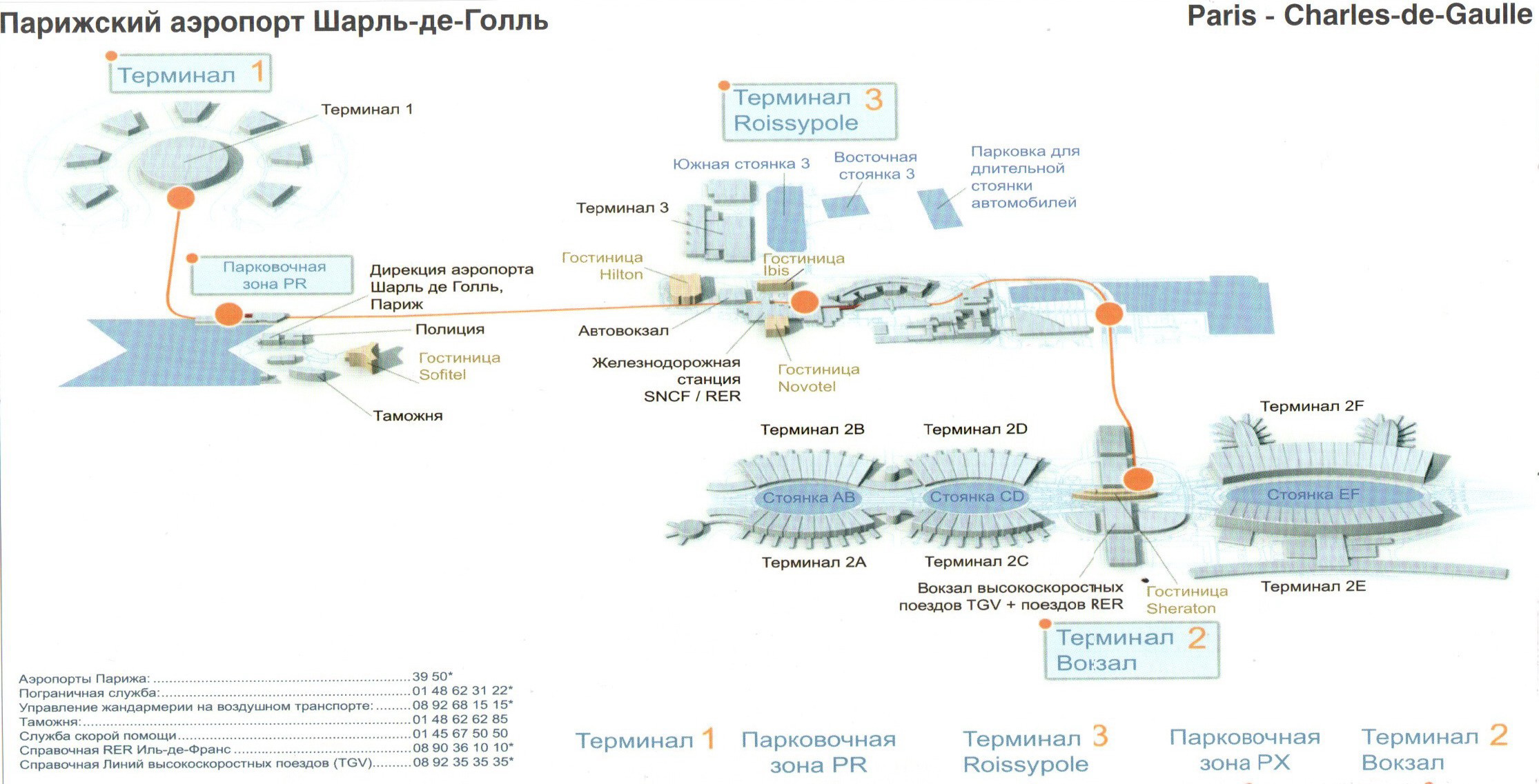 Аэровокзальный комплекс состоит из 8 терминалов, поэтому с непривычки тут легко заблудиться. Опытные путешественники советуют обязательно ознакомиться с картой аэропорта Шарль-де-Голль и схемой терминалов на русском языке.