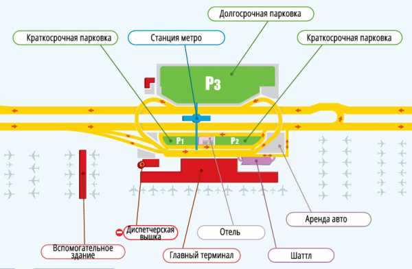 - Долговременная парковка. Расположена Р3 рядом с главной дорогой доступа в аэропорт, вмещает 5800 транспортных средства.
