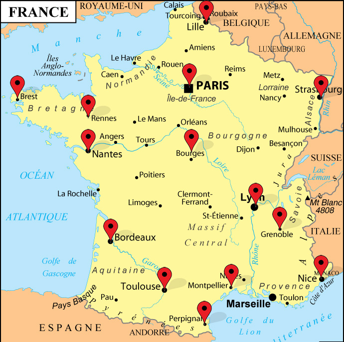 На карте Франции с городами на русском языке можно посмотреть расположение всех населенных пунктов страны, включая самые крупные. К ним относятся: