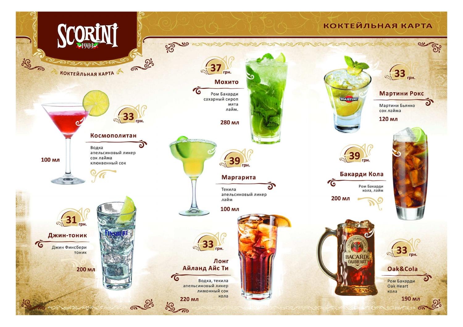 Меню должно включать в себя оптимальное количество предлагаемых гостю напитков, поскольку если оно слишком длинное, то посетитель устанет изучать его уже через полминуты. В специализированном коктейльном заведении, где профессиональный бармен способен приготовить и интересно подать клиенту множество разнообразных и сложных напитков, это около 60 позиций, в обычном баре – от 20 до 40. Главное, чтобы меню гармонично сочетало в себе и базовые популярные и специализированные авторские предложения.