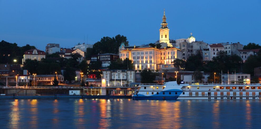 Panorama von Belgrad bei Nacht mit Fluss Sava