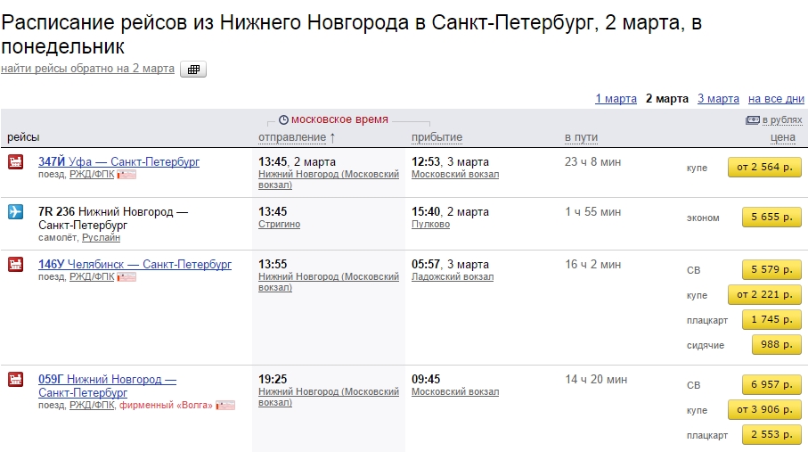 | СЛАВЯНСКИЙ ЭКСПРЕСС | 22/02 — 0:30 Moscou | 9:30 Sankt-Peterburg | 9ч.00мин. | 1431 ₽ |