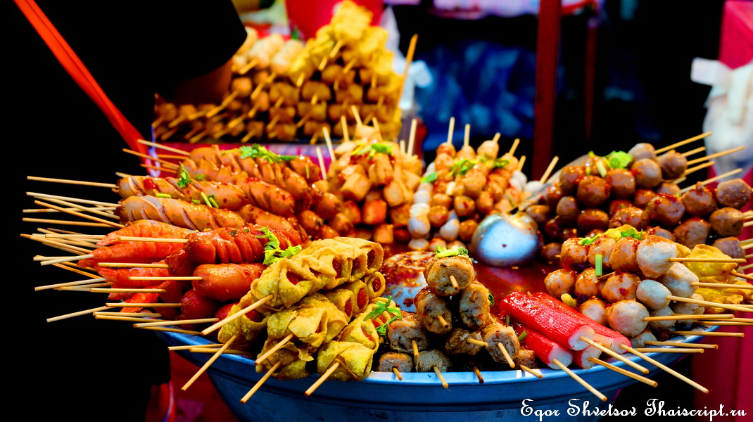 - рыбные или мясные шарики – 10-15 бат за штучку;