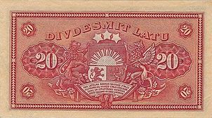 Министерство финансов, в свою очередь, выпустило государственные казначейские билеты номиналом 5, 10 и 20 латов. Они были напечатаны в Государственной типографии ценных бумаг. Дизайн банкнот разработали художники Рихард Зариньш, Карлис Краузе и Харий Грицевичс.