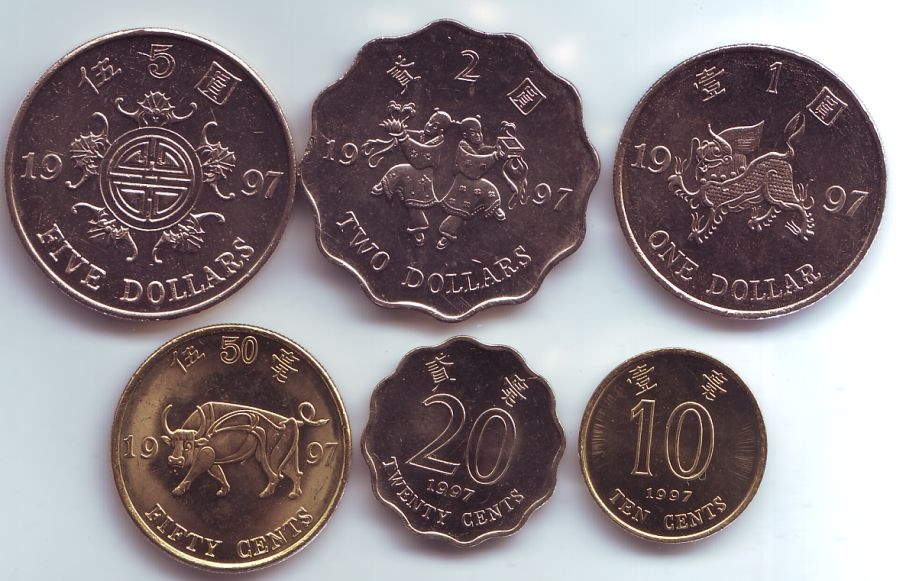 Монеты: Монеты номиналом 10 центов крошечные и сделаны из бронзы. Монеты номиналом 20 центов выполнены из бронзы с волнистым краем. Монеты в 50 центов крупнее и бронзовые. Монеты в 1 гонконгский доллар серебряные, тонкие и большие. Монеты номиналом 2 гонконгских доллара серебряные, большие и с волнистым краем. Монеты номиналом 5 гонконгских долларов серебряные, толстые и большие, а монеты номиналом 9Удобные монеты 0003 номиналом 10 гонконгских долларов отличаются от