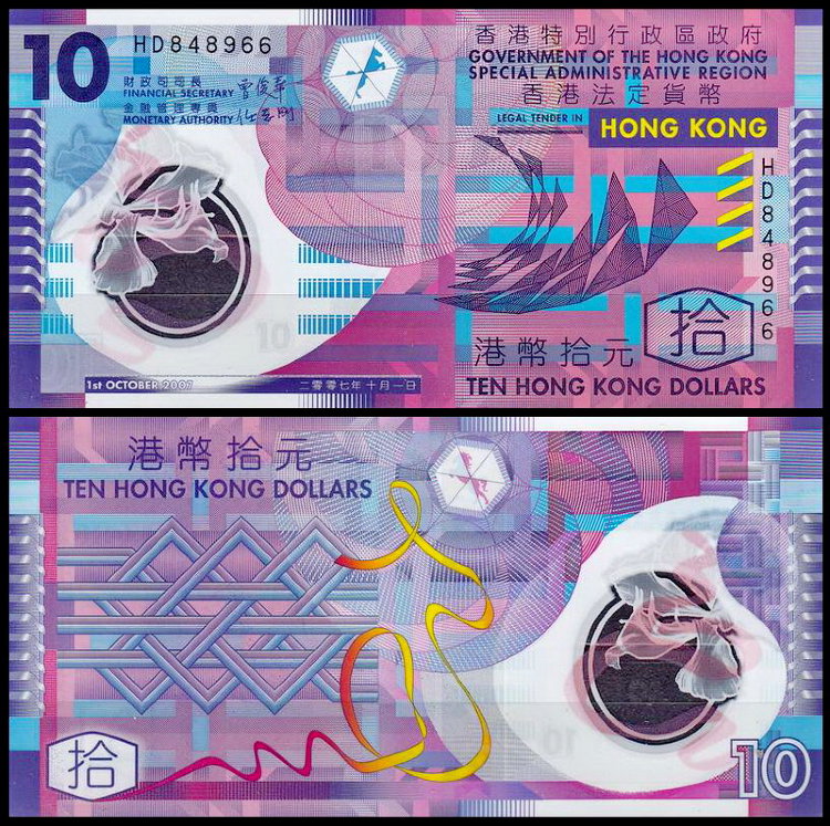 Три банка, Hongkong and Shanghai Banking Corporation (HSBC), Bank of China и Standard Chartered Bank, выпускают собственные красочные банкноты номиналом 10, 20, 50, 100 и 500 гонконгских долларов. и 1000 гонконгских долларов. Правительство также выпускает банкноту в 10 гонконгских долларов. Что касается монет, то они выпущены правительством из бронзы номиналом 10, 20 и 50 гонконгских крон; серебром за 1, 2 и 5 гонконгских долларов; и из никеля и бронзы за 10 гонконгских долларов.