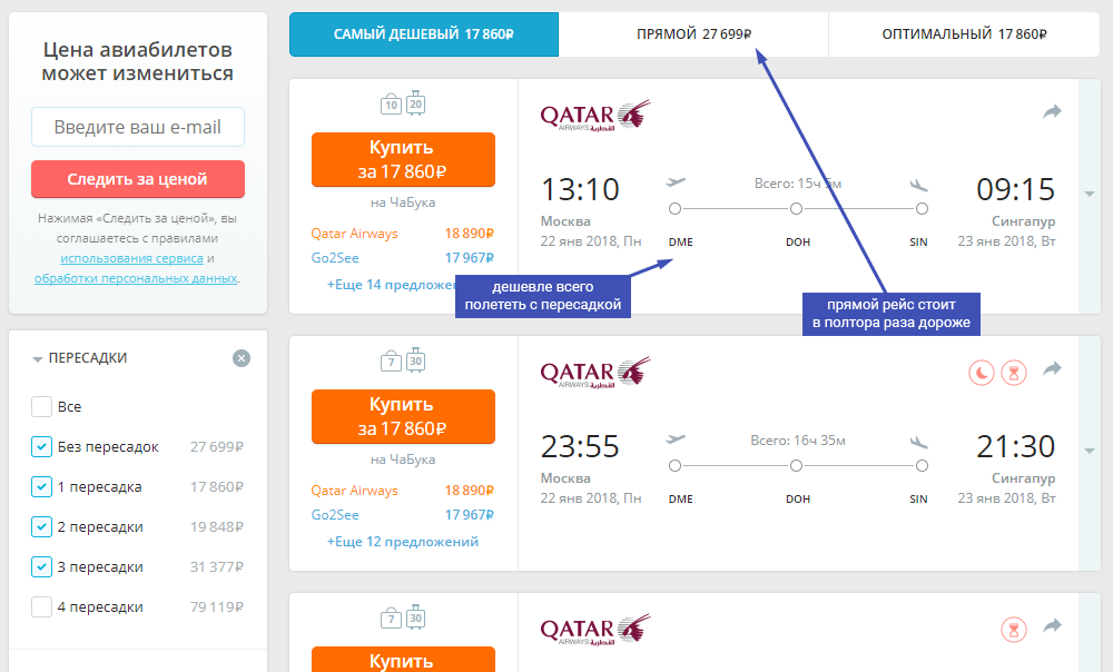 Этот вариант связан с предыдущим, но мало кто понимает, как он работает. В большинстве случаев бронирование рейса с пересадкой может быть намного дешевле, чем прямой рейс до конечного пункта назначения.
