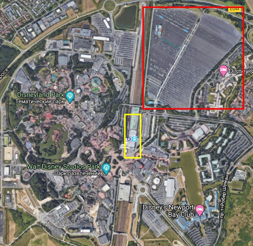 Давайте посмотрим, как делают в других парках. Вот, к примеру, парижский Диснейленд. Здесь парковка расположена на отшибе. Человек, который приехал на машине, потом идёт где-то километр. Кстати, станция поезда – прямо около входа в парк.