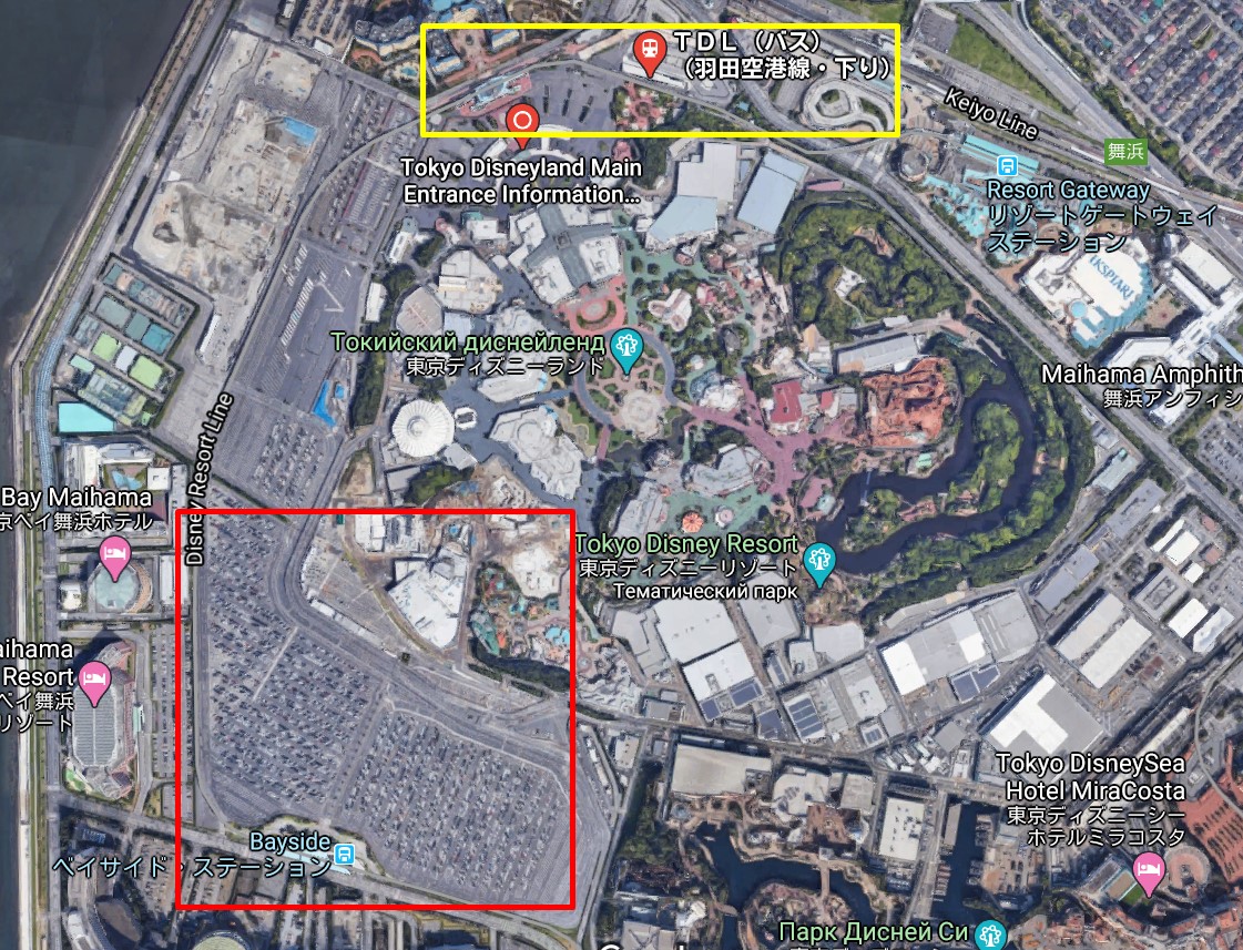 Токио – перед входом большая площадь и станция, паркинги отнесены максимально далеко.