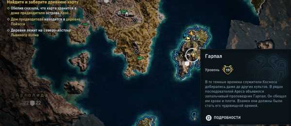 Первую подсказку можно найти в руинах «Сожженный храм Геры» (Аттика). Вторая подсказка выпадает с Хрисис. Также можно убить Гарпала не имея двух подсказок. Он находится в пещере Ареса на острове Кеос.