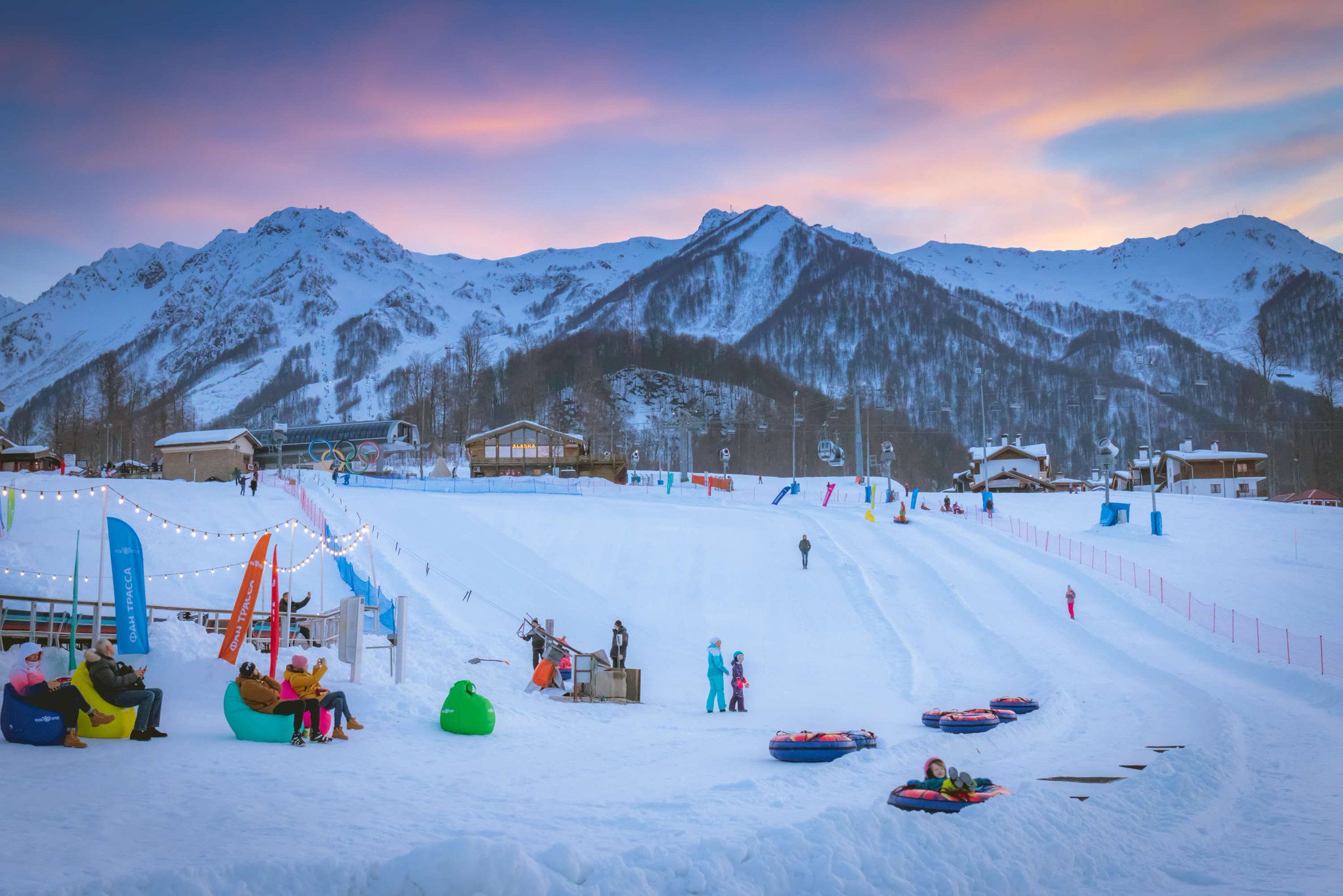 Расположенный в часе езды в горах Кавказа, «Роза Хутор» ориентирована на семью. Дети составляют многие из тех, кто на прошлой неделе наслаждался густой пудрой на склонах. Сильный снегопад означал, что было невозможно создать ледяную твердую поверхность, необходимую для скоростного спуска и гонок супер-гиганта, но оставил хорошие условия для новичков.Руководство «Роза Хутор» делает ставку на тех детей, которые через несколько десятилетий приведут свои семьи.