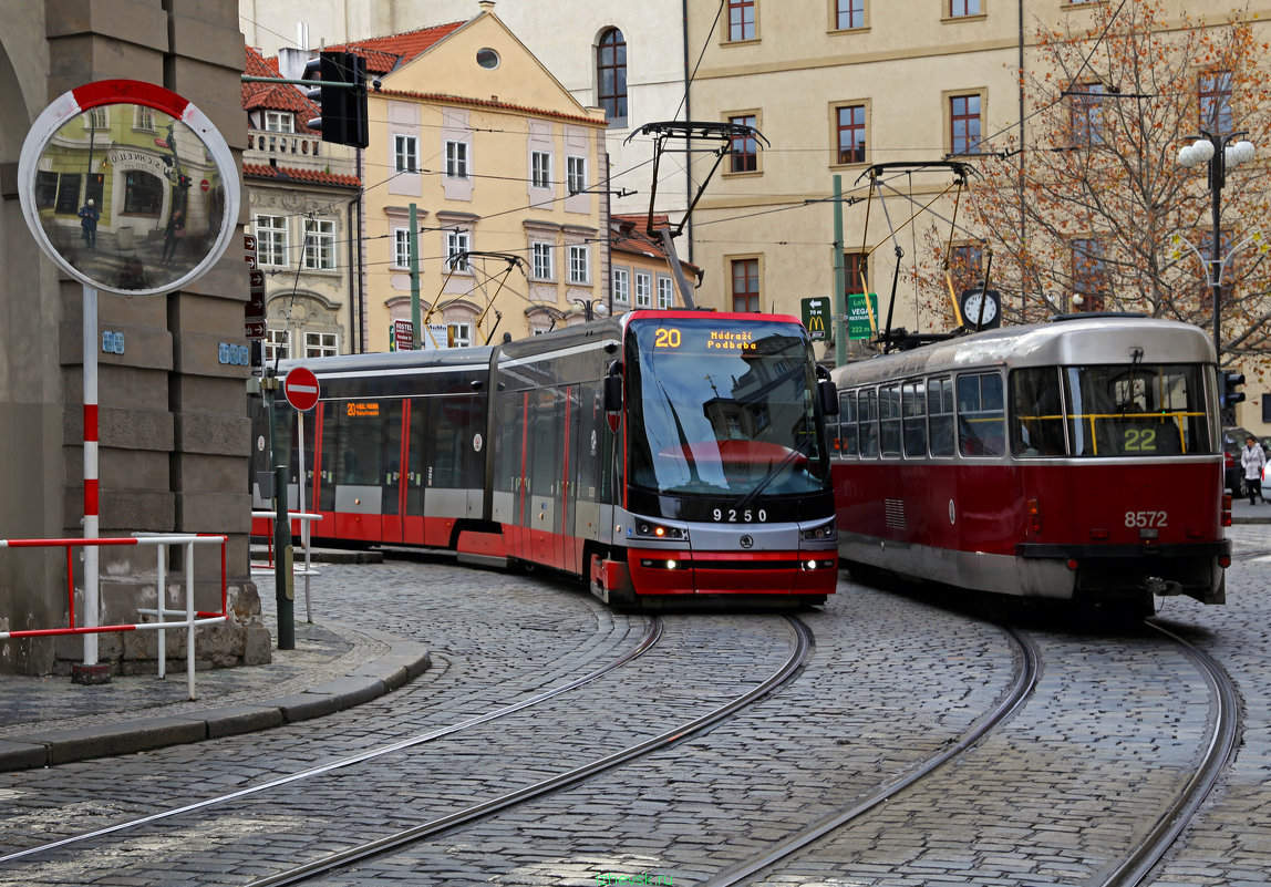 Пражская трамвайная сеть — одна из самых больших в Европе. Дневные маршруты имеют нумерацию от 1 до 26 и ходят с 05:00 до 00:00 с интервалами 8 минут в загруженное время суток и 10-20 минут — в другие часы. Трамваи № 9, 17, 22 имеют меньший промежуток из-за большой популярности — 4 минуты в час пик и 5-10 минут в остальное время.