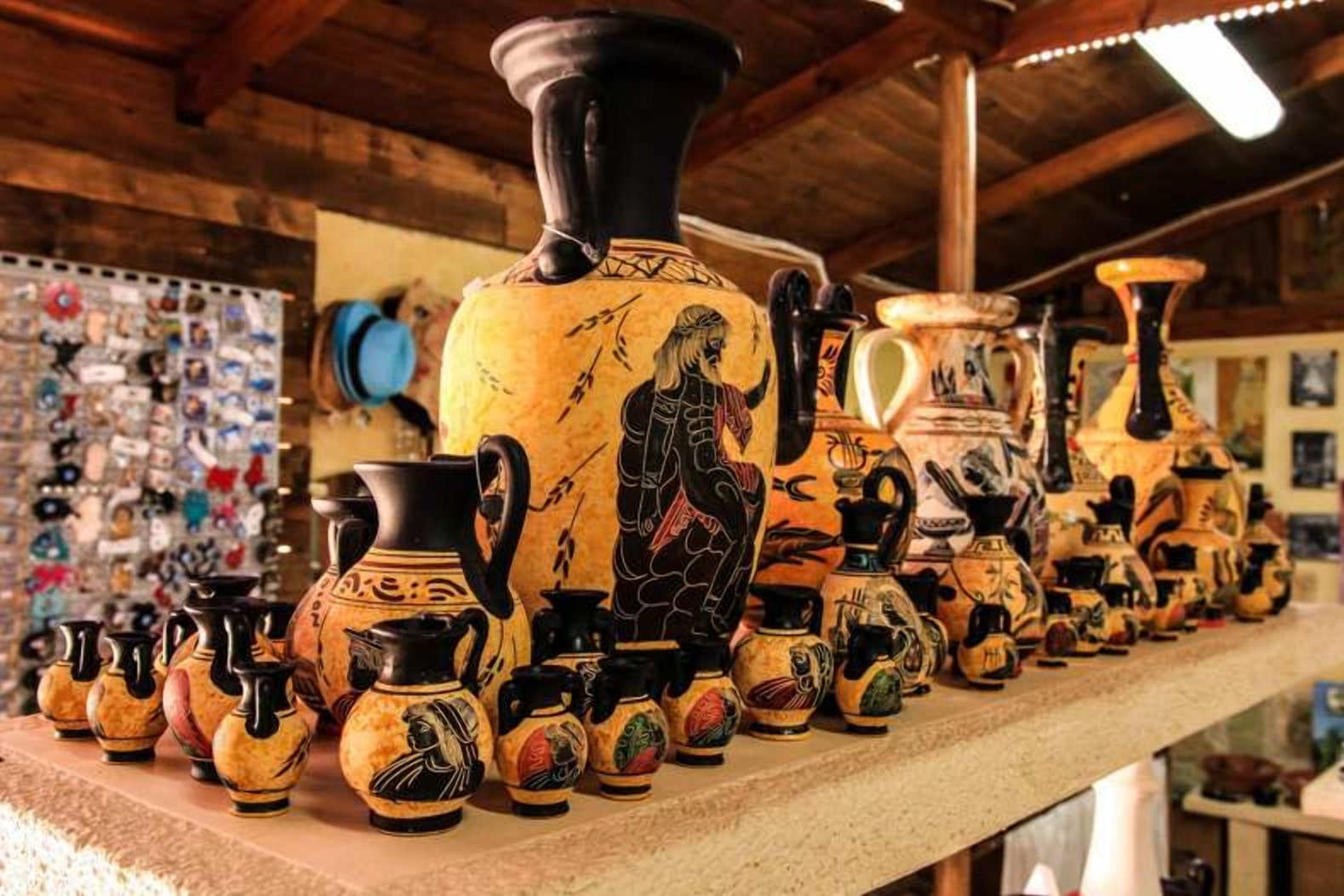 Нельзя пройти мимо великолепной керамики и изделий из обожженной глины — разноцветные и однотонные греческие амфоры, кувшины, миски, тарелочки, блюдца и другая посуда красуются на прилавках сувенирных лавок и магазинов искушая женскую половину туристов.