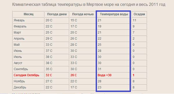 | Месяц | Температура морской воды °C | |||
