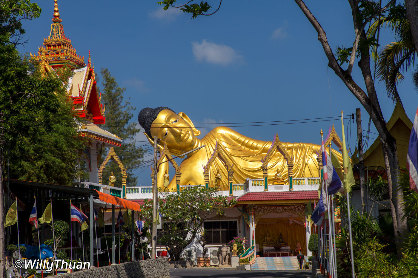 Ват Шри Сунтон (Ват Срисунторн) известен огромным золотым Буддой, лежащим на вершине большого здания в позе «Панг Сай Ят», что соответствует «Осознанию Нирвана» (подробнее здесь). Статуя, кажется, бесконечно смотрит на бешеный трафик на близлежащей дороге, ведущей к международному аэропорту Пхукета. Конечно, вы уже знали, что «Ват» — это тайское слово, означающее «Храм».