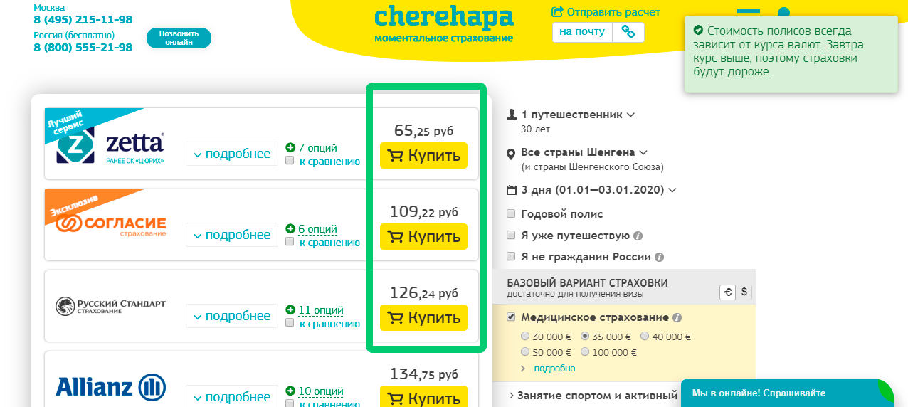 Никаких переплат. Цены на электронные полисы на сайте Черехапа соответствуют действующим тарифам страховых компаний и даже дешевле. Это связано с тем, что страховые компании конкурируют между собой на электронной площадке Cherehapa, чтобы привлечь клиентов;- Покупка онлайн. Не надо тратить время на поездку в офис страховой компании, оформление и покупка туристической страховки через интернет.