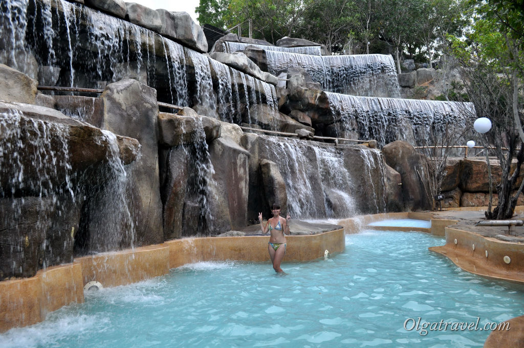 Этот круглый бассейн с лежаками под крышей облюбовали местныеБассейн мелкий, вода теплая, джакузи нетЧуть выше несколько теплых бассейнов возле водопадов. Мне понравился вот этот: очень удобно, что сначала сидишь в горячей воде, а затем идешь под водопад в холодную воду.