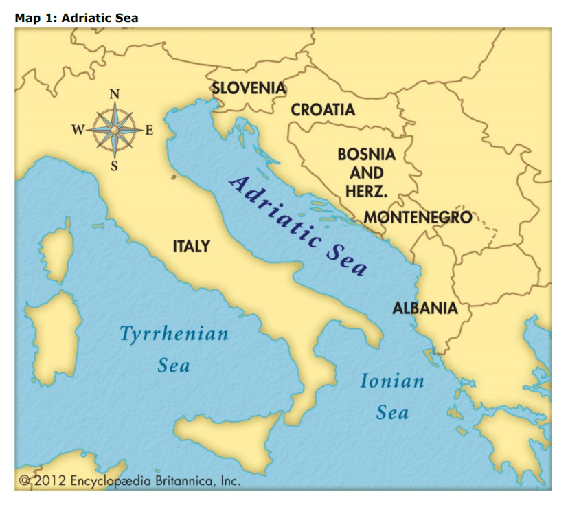 Адриатическое Морское полукочанное море, а также часть Средиземного моря. Расположен между Балканами и Аленинским полуостровом. Омывает берега многих стран: Италии, Словении, Хорватии, Черногории, Боснии и Герцеговины, , Албании, .