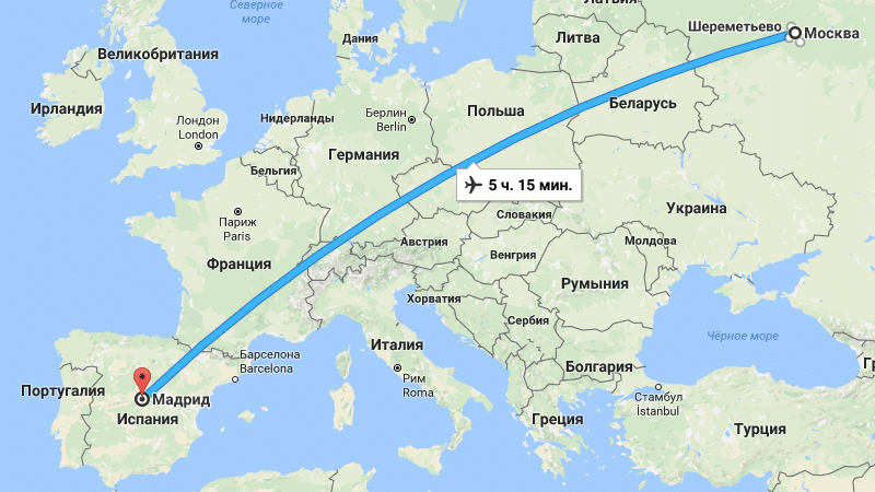 Прямой перелёт в среднем длится 2 часа 20 минут, за это время самолёт преодолевает расстояние в 1433 километров.