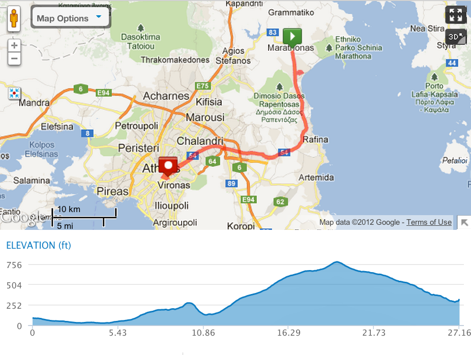 Расстояние между Марафоном и Афинами по дороге составит 41 км, это примерно 43 мин. в пути на автомобиле.