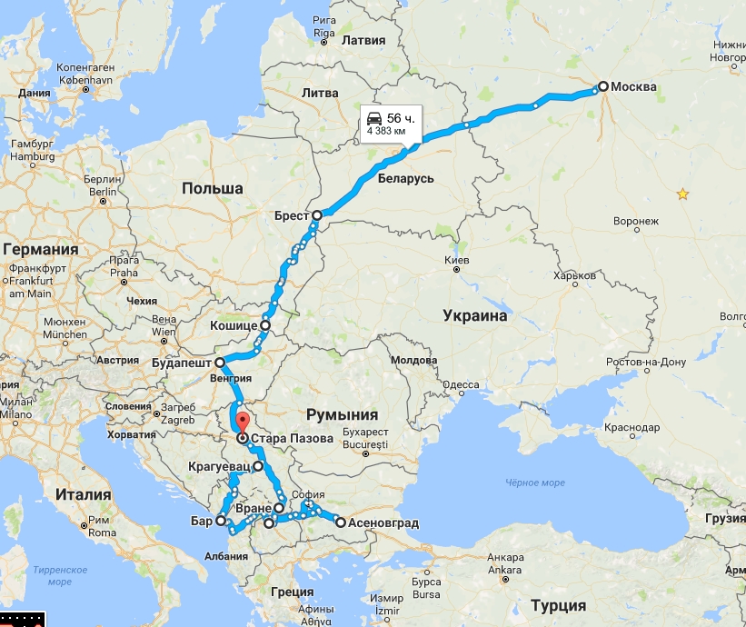 - Киев – Ужгород – Венгрия – Сербия (Белград, дорога на Ниш и далее) – Черногория