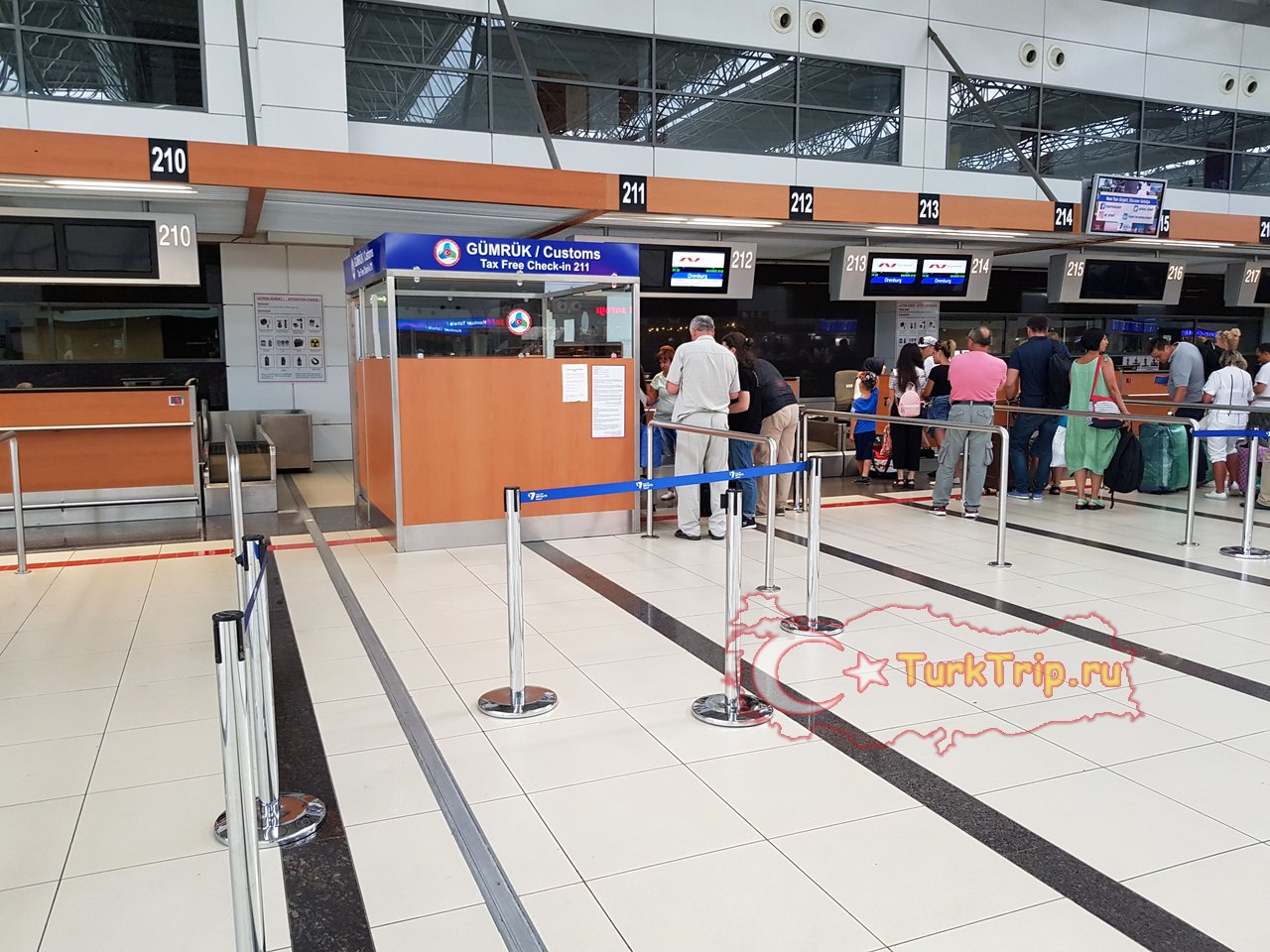Нашел я его сразу же — в пяти метрах слева от меня через стойку № 211 находился киоск с надписью Gümrük/Customs на синем фоне. Там я увидел объявление, что на таможню надо подойти после регистрации на рейс — с посадочным талоном, чеком и покупками.