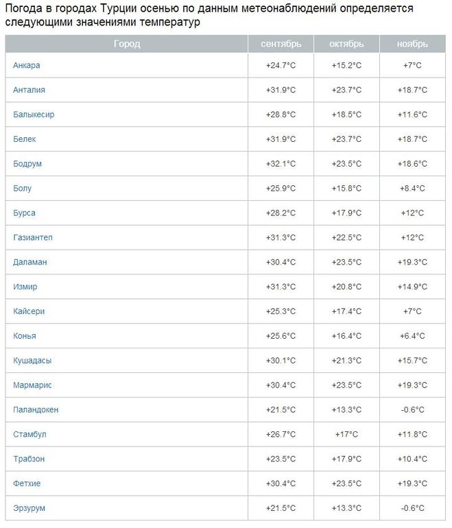 В Стамбуле и Анкаре средняя температура составляет 60-62 градуса по Фаренгейту, а в Анталии и Каппадокии средняя температура составляет от 68 до 69 градусов по Фаренгейту. В большинстве городов в течение месяца остается относительно сухо, хотя в прибрежных районах могут продолжаться зимние дожди.