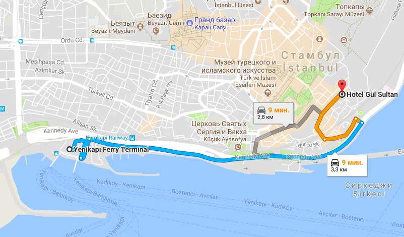 Важный причал, в нескольких остановках от центра. От него можно добраться до азиатских районов Кадыкёй и Бостанджи или в европейский р-н Бакыркёй (там стамбульский аквариум и аэропорт Ататюрка). От Йеникапы плывем в провинции Ялова, Гемлик, в города Бурсу и Измир. - Эминёню (Eminönü)/Сиркеджи (Sirkeci). От него можно доплыть в Бешикташ, Кадыкёй и в Юскюдар. От Сиркеджи идут морские автобусы в Бурсу и др. города.