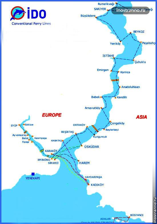 Карта внутренних паромных линий Стамбула, выполняемых компанией-перевозчиком IDOНо переживать не стоит — маршрутов в Стамбуле намного больше, и большинство из них совершает не ИДО, а другие перевозчики.