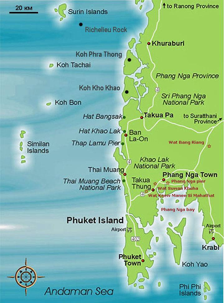 Сама береговая линия простирается от Южного пляжа к северу от Тхап Ламу до пляжа Банг Сак в нескольких километрах к югу от Такуа Па, предлагая около 30 километров белых пляжей и коралловых рифов. Примерно в 2,5 км к северу Хат-Банг-Нианг – это более тихая версия песчаного блаженства, а Хат-Пакаранг и Хат-Банг-Сак, расположенные в 10 км к северу от Као Лака, предлагают другую красоту с их густыми мангровыми зарослями, холмистыми зелеными полями и непрерывными пляжами.