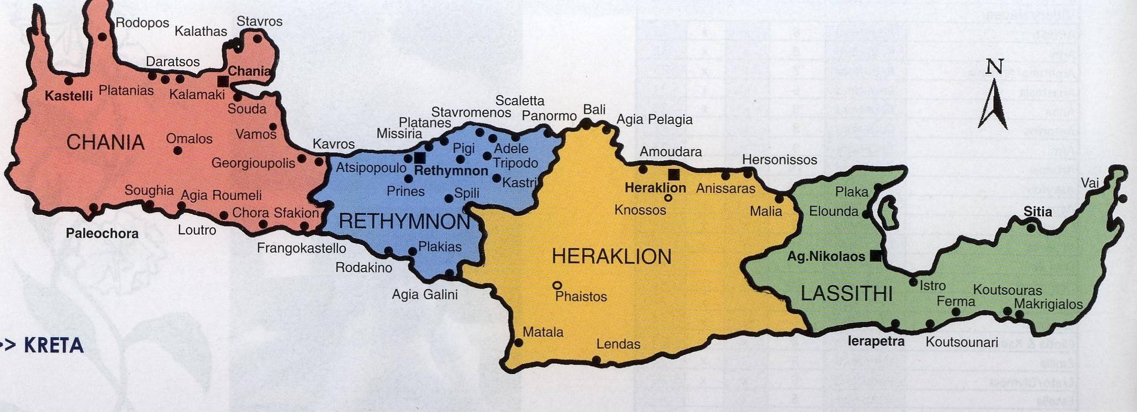 Таблица размещения больниц на Крите Ном Количество Места Ираклион 6 Мойрес • Санта-Барбара • Аркалохори • Кастелли • Харакас • Бианнос Ласити 4 Дзермиадо • Иерапетра • Сития • Неаполи Ханья 3 Ханья • Вамос • Киссамос • Кантанос Ретимнон 4 Спили • Санта-Фотини • Перама • АногияОбщее количество жителей, которые обращаются в службу первой медицинской помощи, — 165 696.