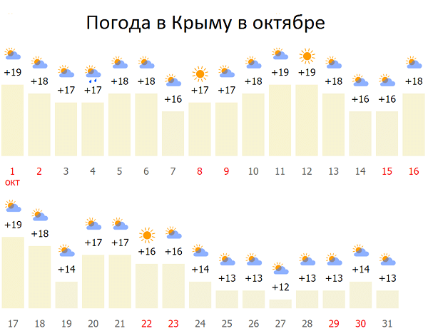 Погода в Крыму в конце сентября в этом году будет располагающей к активному отдыху. Теплые дни продлятся до начала октября, когда сменятся холодными дождями. Именно погодные условия сентября идеальны для людей, которые хотят посмотреть как можно больше достопримечательностей: туристов в городах немного, нет очередей в музеи, благодаря мягкому солнцу или облачности можно проводить на открытом воздухе целый день. Потрясают воображение и крымские пейзажи: багровые леса на фоне лазурных вод, высушенные за лето жарким солнцем степи, желтеющие виноградники. Приятно порадуют цены на отдых — они будут ощутимо ниже летних. Кстати, по отзывам туристов, именно начало осени является лучшим месяцем, чтобы поехать на большинство крымских курортов. Как видно по прогнозу погоды, погода в Крыму в сентябре 2023 порадует температурой выше +20 °С днем и +15 °С ночью.
