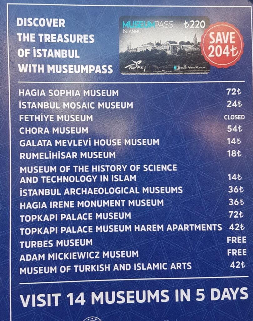Стоимость посещения музеев и достопримечательностей в Стамбуле, по состоянию на октябрь 2019 года, приведена на фото ниже. Для экономии средств и времени на проход (проход осуществляется без очереди), можно приобрести музейную карту Стамбула за 220 лир, которая действует в течение 5 дней. В эту стоимость входит посещение каждого из музеев и достопримечательностей Стамбула, указанных в списке на фото. Купленная музейная карта не является именной и ее можно передавать кому-либо. Однако войти по ней, в каждый из музеев, можно только один раз. Обратите внимание на то, что в эту музейную карту, не входит посещение достопримечательности Стамбула — Цистерна Базилика.
