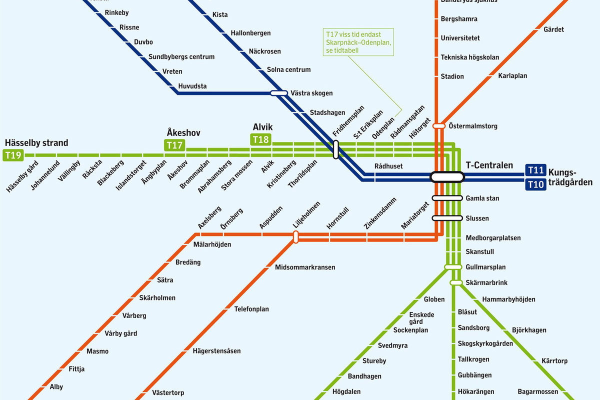Обозначаются буквой J. Ходят по всем трем зонам с интервалом в 15 минут (в час пик — чаще). К 2018 году под центром Стокгольма планируют достроить 6-километровый тоннель, который поможет сделать систему еще более пунктуальной.