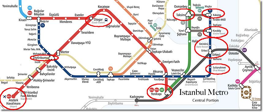 Станции туннеля/метро (7 станций): Йеникапы, Аксарай, Эмниет — Фатих, Топкапы — Улубатлы, Бакыркой — Инджирли, Бахчелиэвлер, аэропорт Ататюрк,