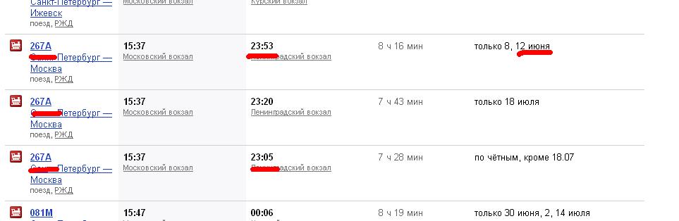 | Номер поезда | Маршрут | Отправление | Прибытие | В пути | Примерные цены | Дата поездки |