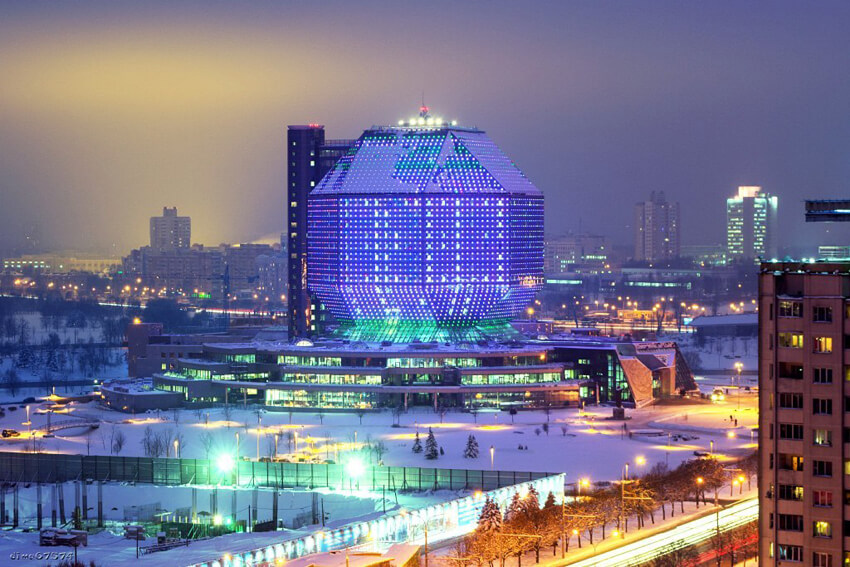 Ультрасовременное здание Национальной библиотеки Беларуси — одна из самых известных достопримечательностей страны и визитная карточка столицы. Огромный ромбокубооктаэдр издалека напоминает ограненный алмаз, а с заходом солнца его медиафасад площадью 1985 м2 начинает сверкать и переливаться разными цветами. По версии американского журнала Flavorwire, здание заняло 11-е место в рейтинге самых фантастических архитектурных работ планеты, было упомянуто в берлинском издании «Лучшие библиотеки мира».