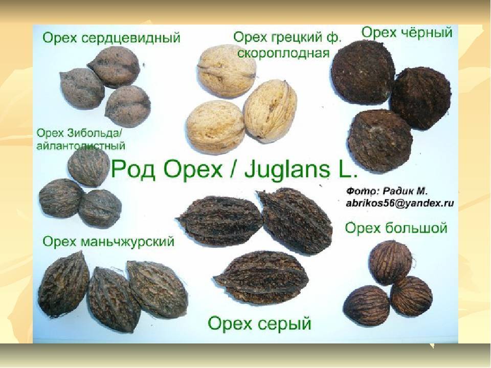 Грецкий орех представляет собой костянку, то есть имеет внешний мясистый слой, окружающий твердую скорлупу. Черный грецкий орех, произрастающий в Северной Америке, является наиболее распространенным видом. Другие популярные сорта включают английский грецкий орех, калифорнийский грецкий орех и японский грецкий орех.