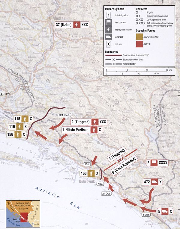 1 октября 1991 года подразделения ЮНА из Черногории и южной Боснии перешли в наступление на хорватскую территорию и захватили Превлаку, Конавле и Цавтат[15]. Югославское командование активно использовало десантно-штурмовые части при захвате окрестностей Дубровника и международного аэропорта. После захвата аэропорта ценное оборудование было вывезено в Черногорию[прим. 3]. Югославские войска из Боснии также вели бои и выбили хорватские силы из городка Равно в Боснии, хотя война в Боснии начнётся лишь спустя шесть месяцев.