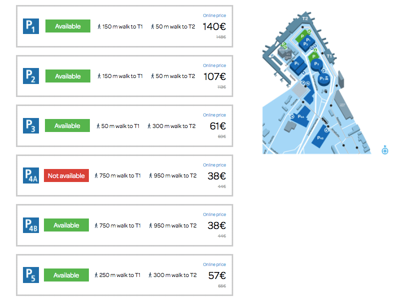 - На краткосрочных стоянках Р1 и Р2 оплата на недельную аренду места для авто варьируется от 110 до 145 евро.