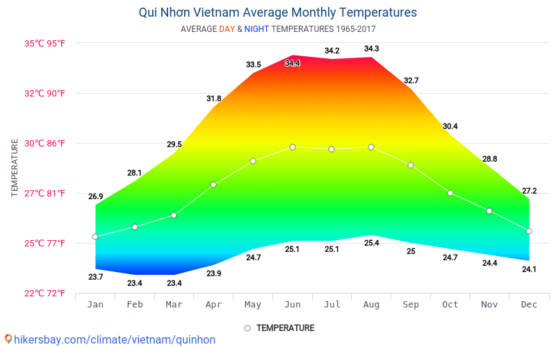 Перепад дневной температуры воздуха в течении года составляет 7.8°C, но из-за наличия моря и климат по месяцам во Вьетнаме довольно мягкий. Самый холодный месяц — Январь, когда воздух прогревается до +25.0°C, а наиболее теплый — Май с +32.8°C. Температура воздуха в феврале составляет +26.9°C.Температура воды во Вьетнаме