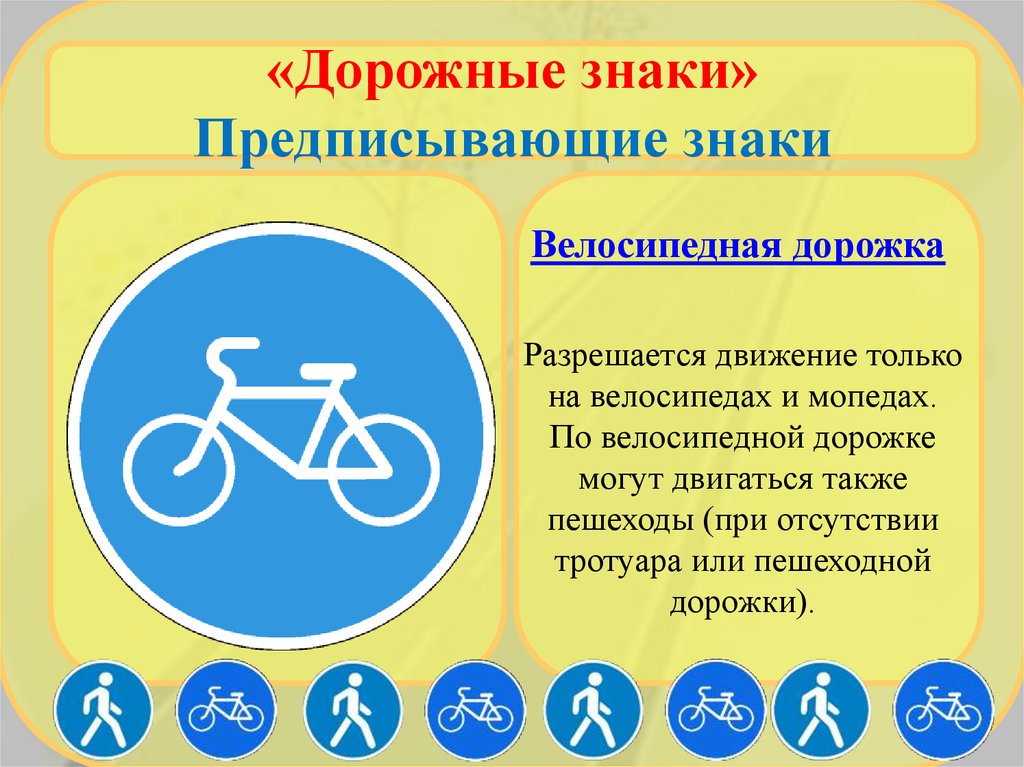| | Этот знак указывает на то, что велосипедисты должны двигаться по левой/правой полосе, а пешеходы должны оставаться справа/слева. Никакие транспортные средства, кроме велосипедов, не допускаются. |