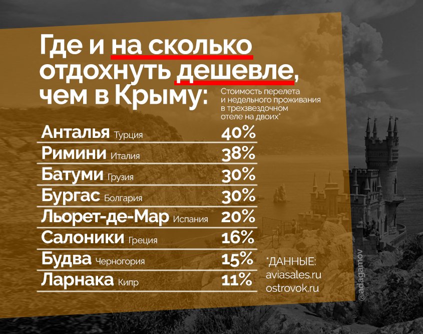 Крым. Полуостров часто называют здравницей под отрытым небом. Наличие огромного выбора санаториев, пансионатов, детских лагерей делает это направление популярным у представителей разных поколений. Чтобы снизить расходы на отдых в Крыму, лучше отдать предпочтение не раскрученным курортам вроде Ялты, Феодосии, Алушты, а небольшим посёлкам, таким как Рыбачье, Малореченское, Солнечногорское. Живописные населённые пункты предлагают жильё по сравнительно низкой стоимости и немноголюдные пляжные зоны даже в разгар сезона. Однако развлечений здесь практически нет: при поездке в Крым с детьми приготовьтесь к тому, что придётся посетить районный центр в поиске аквапарка, дельфинария, зоопарка, цирка, кино.