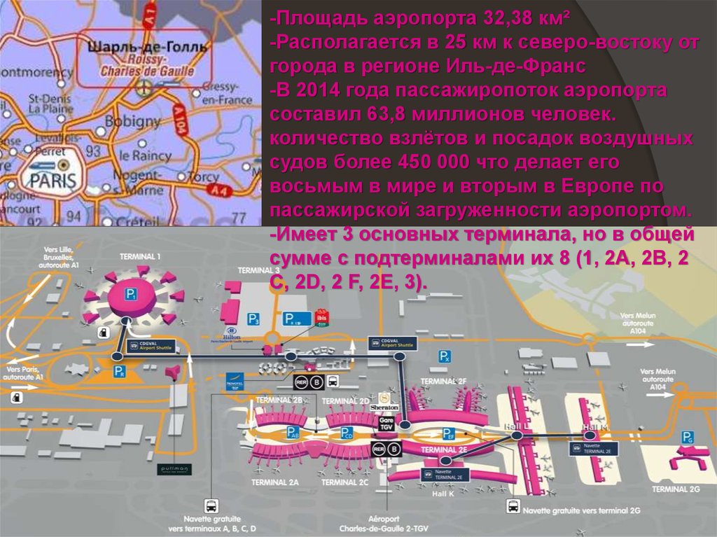 Аэропорт Шарля де Голля в Париже представлен восьмью терминалами, которые обеспечивают его функционирование. Многие приезжие жалуются на то, что из-за такой разветвленной структуры, огромного количества входов, выходов и коридоров в залах этого аэродрома достаточно легко потеряться. Это и не мудрено, ведь между самыми отдаленными аэровокзальными комплексами существует даже своя линия поездов и маршруты автобусов, которые их соединяют.