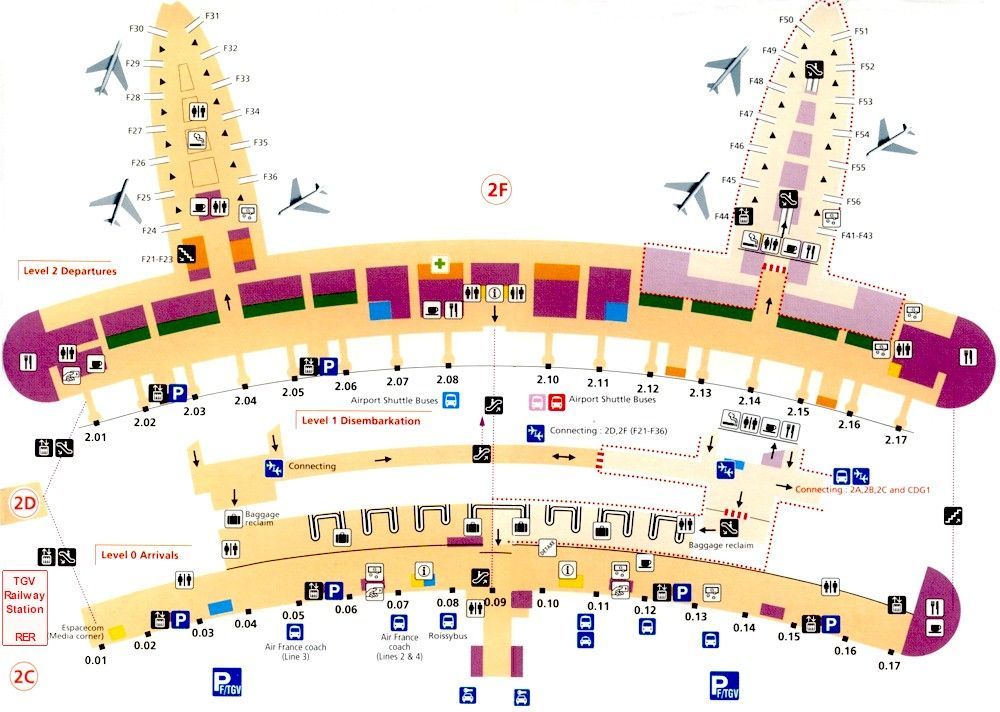 Также в направлении Парижа курсируют поезда SNCF TGV, отстановки которых находятся между терминалами 2E-2F и 2C-2D. Найти выход к ним можно с помощью указателей в залах.